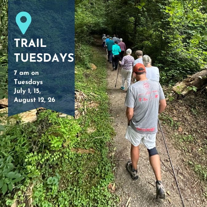 Beginning July 1, we will meet at 7am every other Tuesday to explore a local trail. We will hike out and back for an hour total, and you are welcome to walk at your own pace.